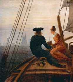 | Поделиться статьей: | Статьи![]() ![]() Искусство > На парусникеСветлана Обухова21 января 1818 года немецкий художник-романтик Каспар Давид Фридрих удивил всех. Уже немолодой и одинокий, чувствовавший себя самим собой только наедине с природой, обычно замкнутый, даже резкий и только в обществе самых близких друзей становившийся заразительно веселым и сердечным, он неожиданно женился на Каролине Боммер. «Как много изменилось в моей жизни, когда я перешел от "Я" к "Мы"! — восклицал Фридрих в одном из писем. — Мой старый, простой дом стал совершенно неузнаваемым, чистым и уютным, и я не могу нарадоваться этому». Изменился не только дом. Всегда веселая Каролина, которую никто никогда не видел в плохом настроении, удивительно умела успокоить вспыльчивого и импульсивного художника. Счастье в любви принесло счастье и в творчестве: 1818 год стал одним из самых плодотворных в жизни Фридриха. Он создал 28 новых картин, среди них хранящаяся в Эрмитаже работа «На паруснике».